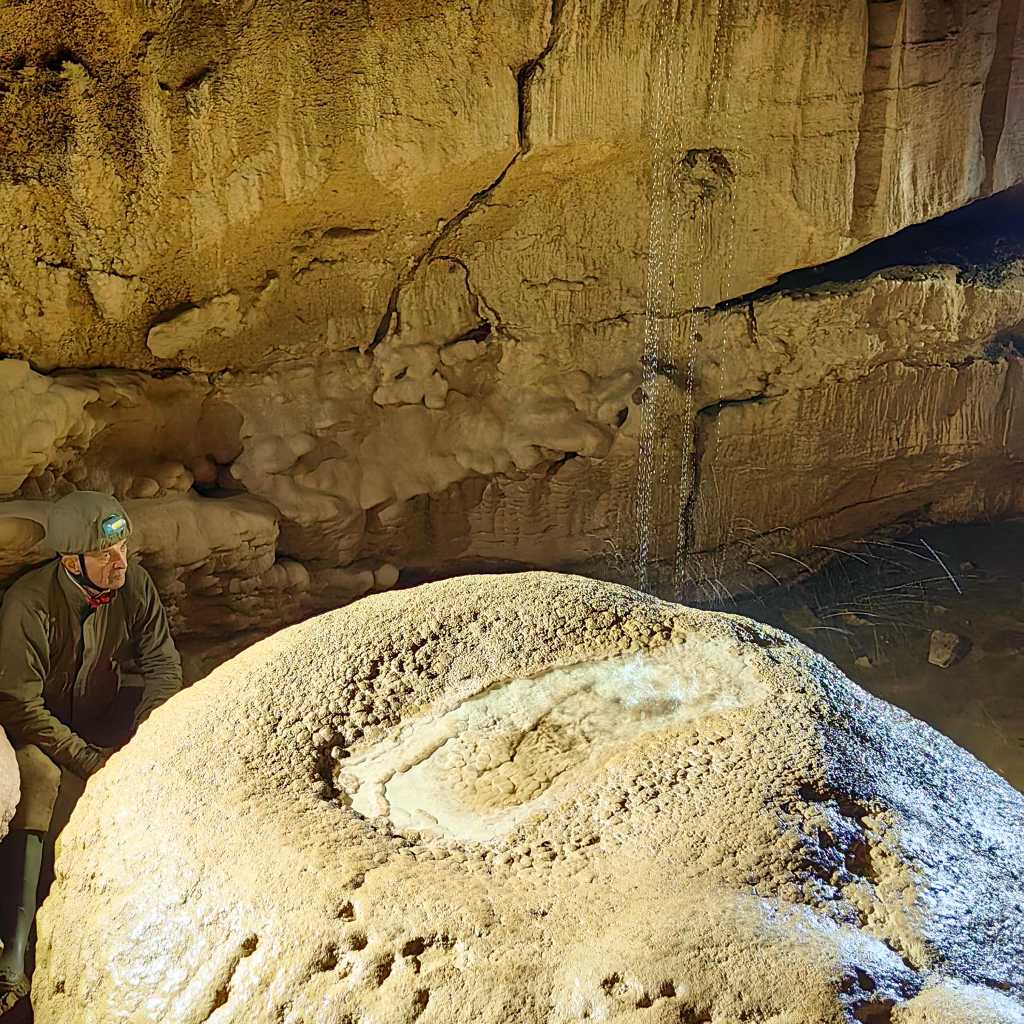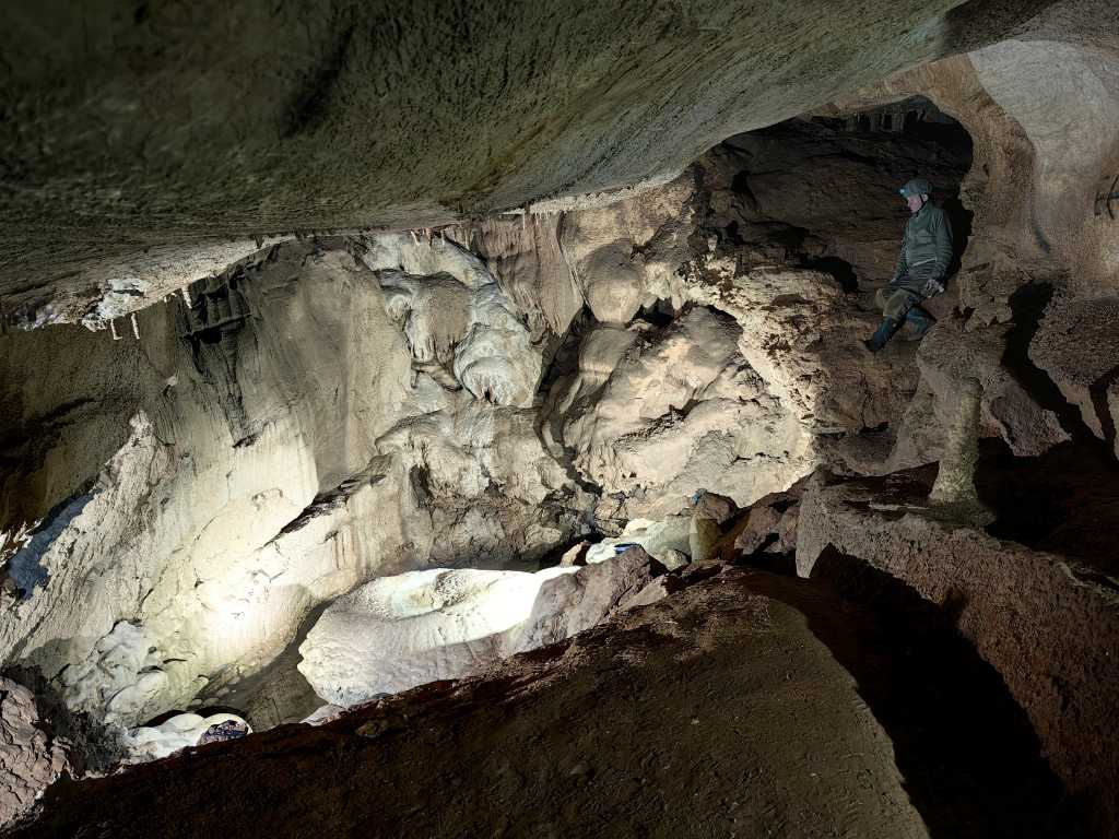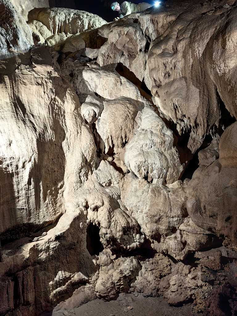 54801. Первоначально экскурсия была направлена на тестирование использования двух двухметровых орешниковых прутьев, соединенных в один с помощью полуметровой алюминиевой трубки. Такой длинный прут имел бы светодиодный прожектор наверху и удерживался бы вертикально на земле пирамидой из камней. Он освещал бы очень высокие сталагмиты, которые встречаются, например, в Липишской Яме. Однако не все компоненты были готовы, и автор также еще не полностью вылечил небольшую травму от предыдущей экскурсии, поэтому посещение Найденой Ямы пришлось провести, так сказать, осторожно. Автора давно соблазнял тоннель Ичо, который не особенно богат фотографическими мотивами, но к концу, как раз перед соединением с Пипарьским тоннелем, он становится очень красочным и полным ярких форм. Спелеологи, включая автора, всегда спешат через него по пути к какой-то другой точки в пещере, и на этот раз туннель, наконец, мог бы получить должное внимание. Но когда автор остановился на этом балконе над западной стороной тоннеля Шерко и у Груди Марии Терезы внизу, уже было ясно, что более подходящим названием для экскурсии будет «От тоннеля Шерко до Фонтана Михлера».