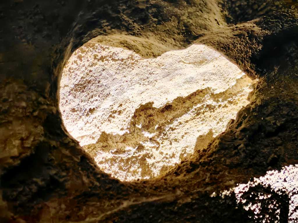 54817. В скальном ноже, который выступает вниз из западной стены тоннеля, расположено это отверстие в форме сердца, прямо над дном тоннеля и концом ножа. В самой широкой точке оно имеет ширину 15,5 см.
