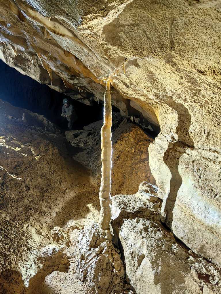 54818. Тонкий сталагмит, который вырос до потолка, расположенныйна прямо перед тем, как тоннель переходит в Зал над Фонтаном Михлера. На фото правая нога автора уже в этом зале.