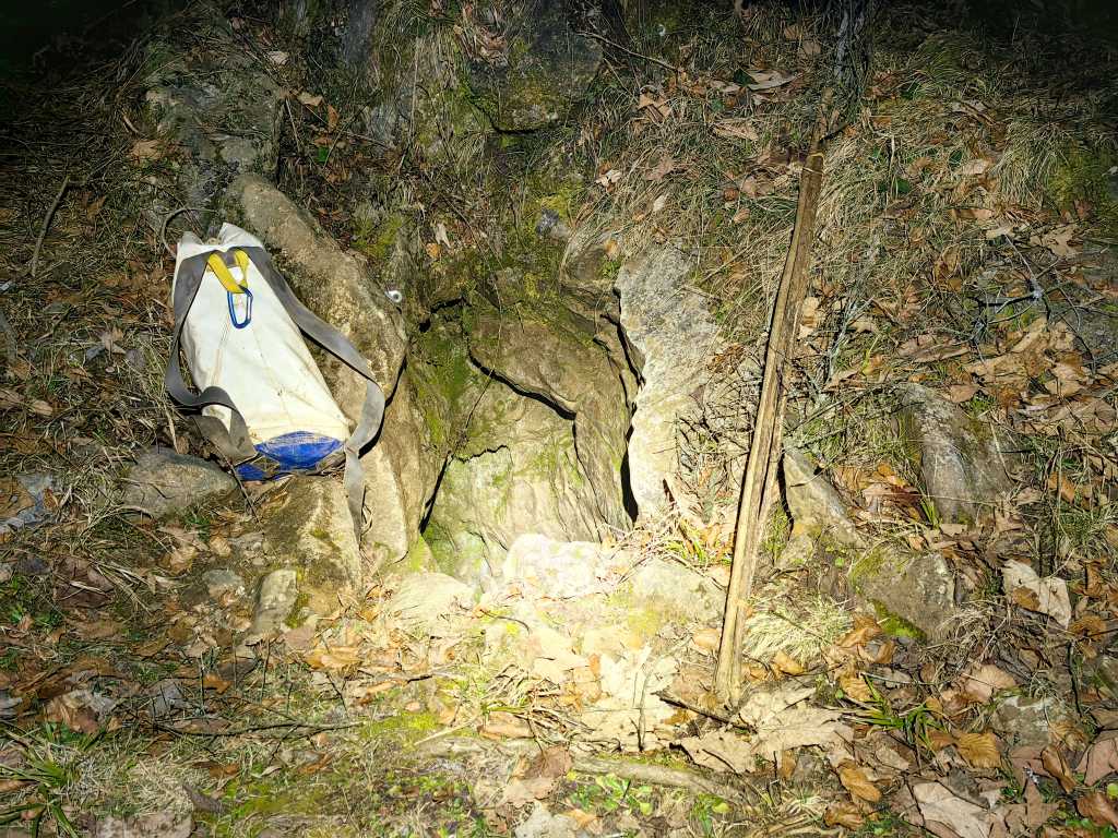 54820. Вход в пещеру с рюкзаком и четырьмя орешниковыми палками, которые помогали освещать пещеру, и кроме того, они также помогали при ходьбе вверх и вниз по крутому склону в тоннеле Шерко, связанные вместе. Незадолго до шести часов вечера уже было совсем темно.