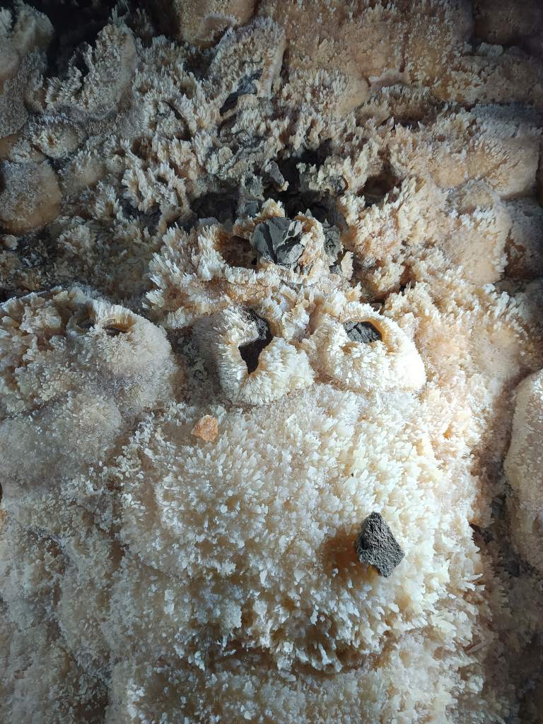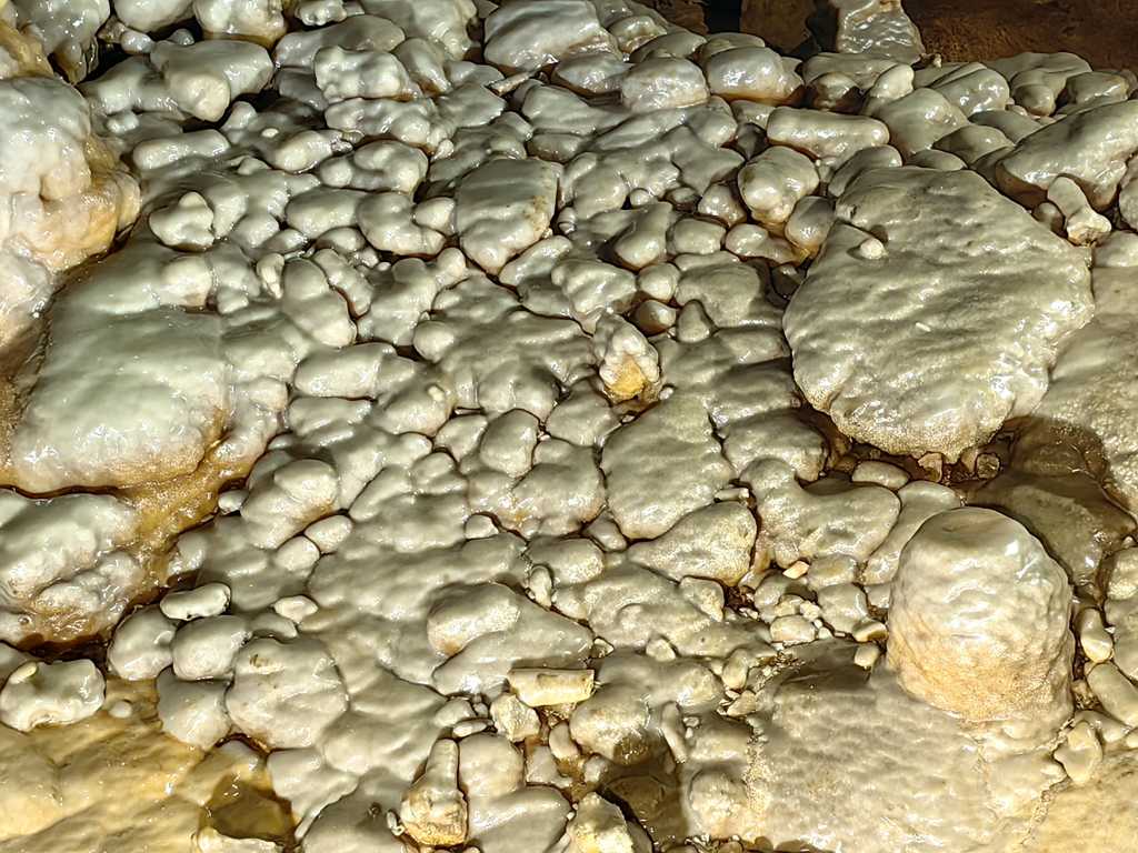 VL52. Cristalli di latte di monte e calcite nella Sala Grande; al centro, in alto, c'è una moneta da 1 centesimo come riferimento per le dimensioni.