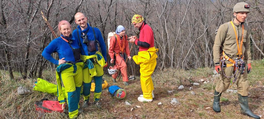 MH3. Preparativi all’ingresso della grotta: Lena, Łukasz, Matic, Vladimir e Jakob