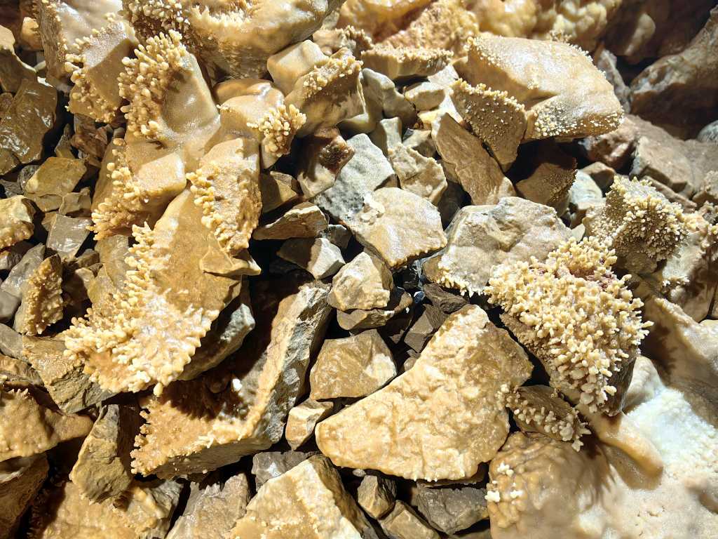 VL53. Cristalli di calcite con inglobati frammenti di calcare grigio scuro caduti dal soffitto