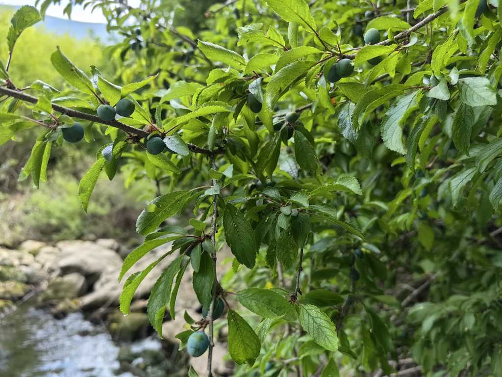 55632. Плоды терновника, Prunus spinosa, уже начали менять цвет с зеленого на синий.