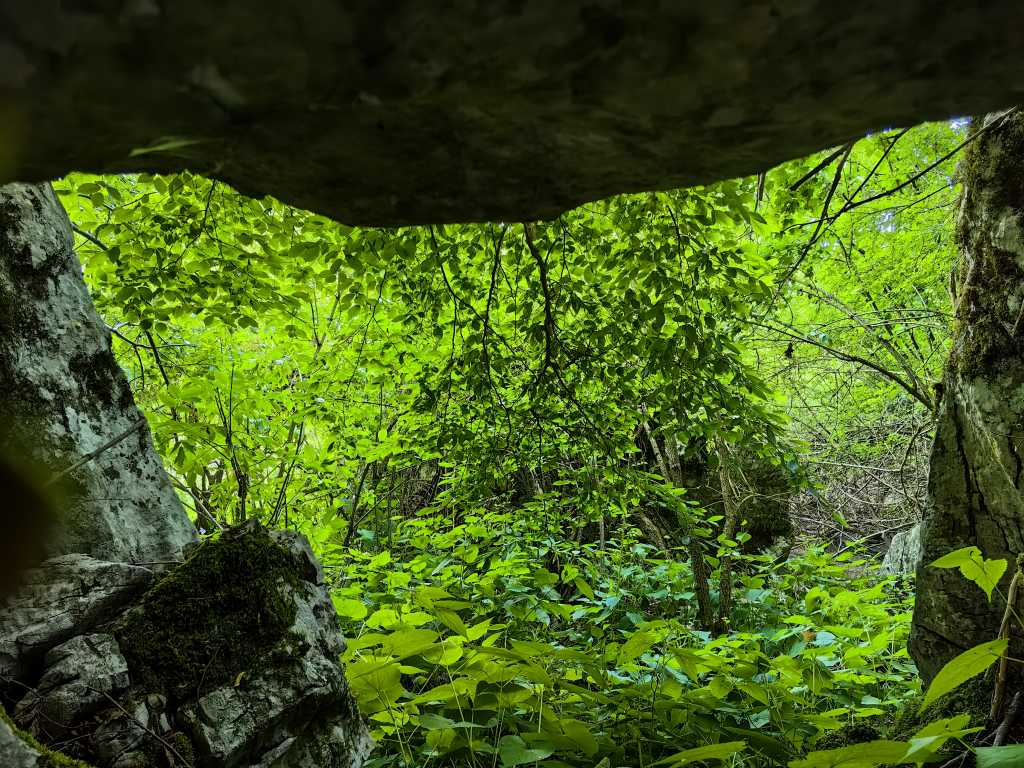55633. Вид из-под каменного навеса в первой бухте клифа над берегом озера, к северу от пещеры Мала Скедненца. Он образовался, когда большой камень, отколовшийся от стены, не скатился до конца, а повис на двух больших камнях, как раз на нужном расстоянии друг от друга.