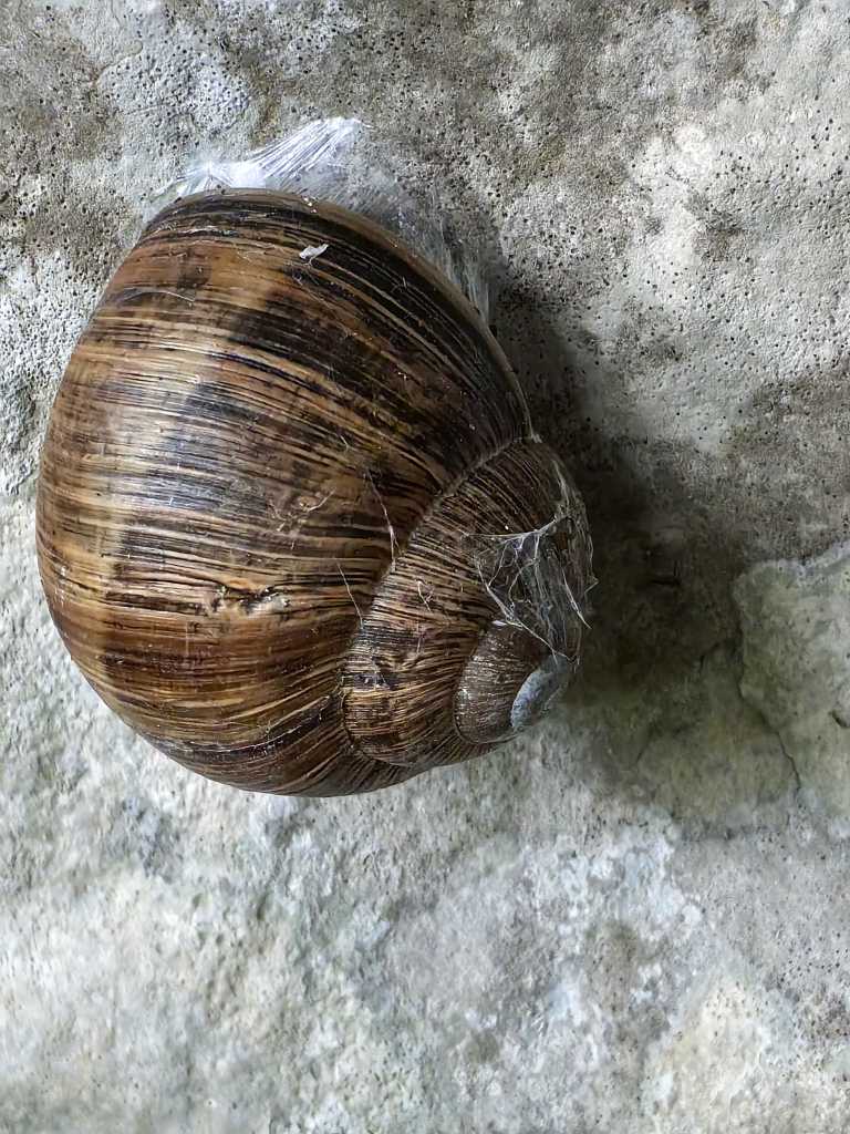 55634. Виноградная улитка, Helix pomatia, приклеилась к стене в навесе.