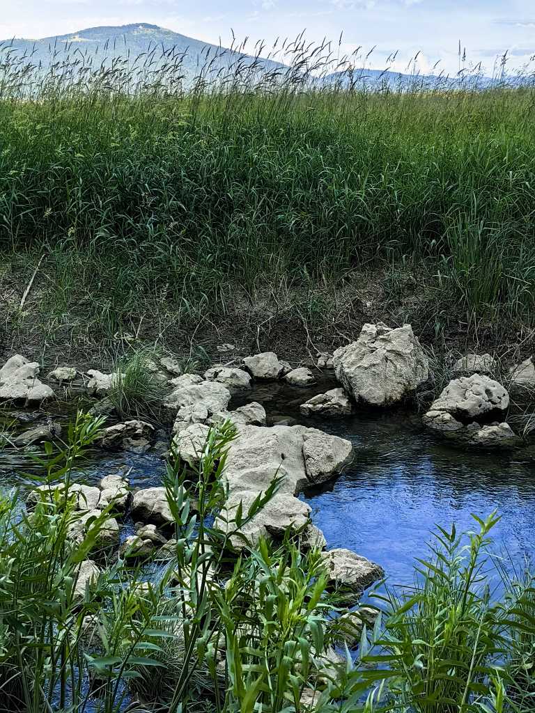 55639. Место в русле, где автор с трудом перешел ручей неделю назад, по затопленным камням. Сегодня они были наполовину сухими. Также большим сюрпризом стало то, что неделю назад вода текла на север, а сегодня - на юг. Ручей Церкнишчица взял верх над Стрженом, и теперь он затапливает не только вход в Раковский мостек, но и простирается дальше, по крайней мере до высоты Великой Карловицы.