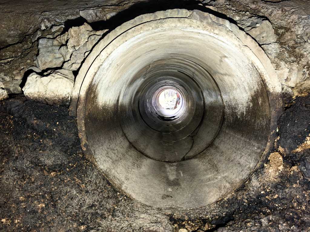 55642. Вид через трубу в плотине у входа в пещеру наружу. Труба сделана из 10 бетонных кусков высотой и диаметром один метр. Шестой кусок, если смотреть снаружи внутрь, сломан внизу и имеет большую дыру, а девятый просто треснул.