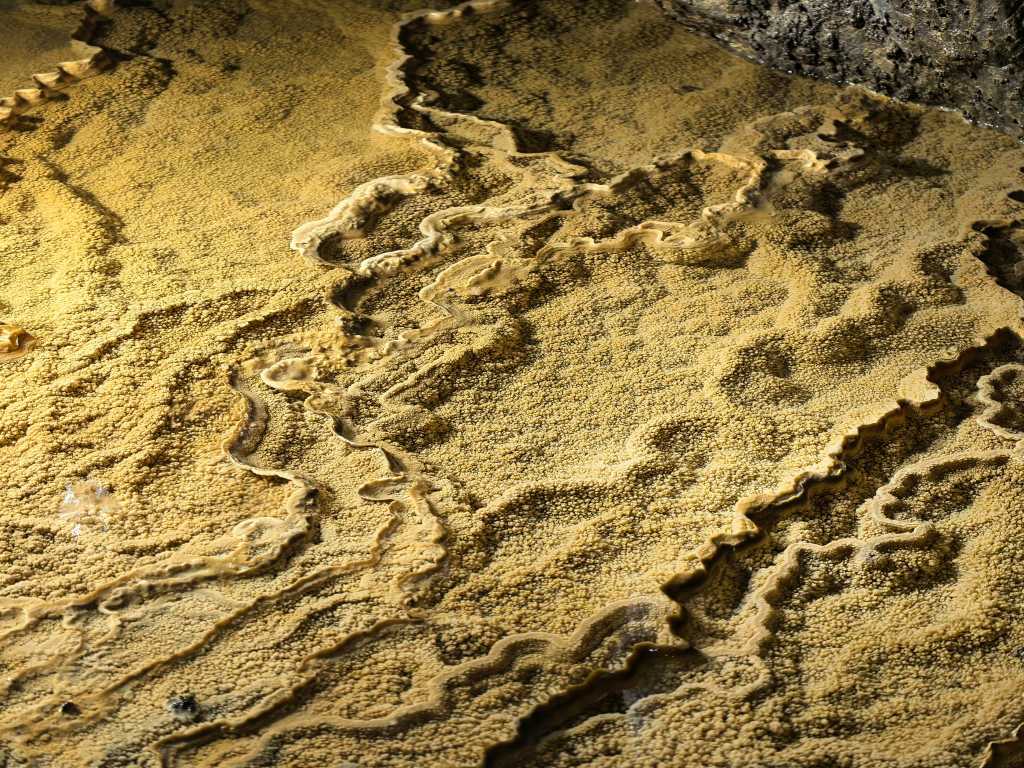 56746. Shallow rimstone pools in the shades of sandy color, with a crystal sprinkling on the bottom and with luxuriously curled edges