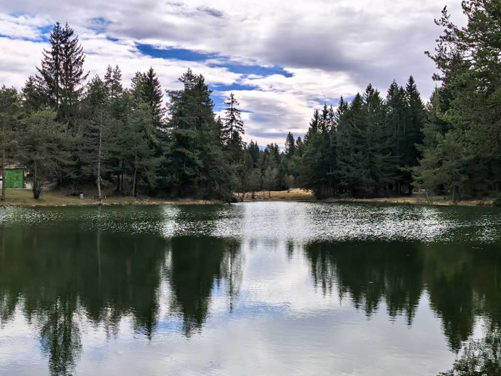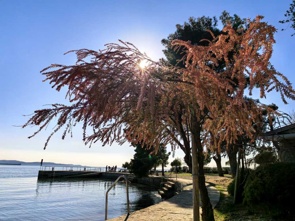 56822. Вид с дамбы у входа в Велику Карловицу на озеро с зелеными ивами