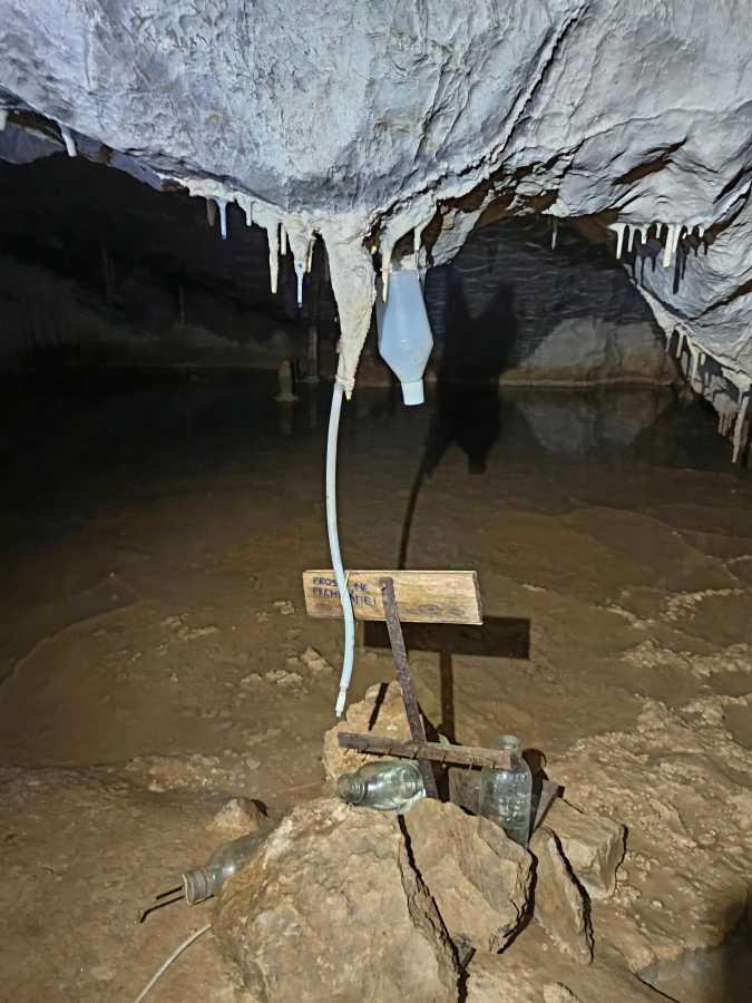 VL98. Prehod do Pristana na južni strani Srebrne dvorane vodi tesno ob zahodnem bregu po kamnih v nič kaj plitvi vodi, pa še precej se je treba skloniti zaradi nizkega stropa. Zato sta Miha in Vladimir iskala druge možnosti ob zahodnem bregu. Prav blizu je nizka dvoranica z vodo po tleh, kjer so krasoslovni znanstveniki nekoč, morda že pred leti, namestili tole instalacijo iz plastičnih cevi in steklenic.