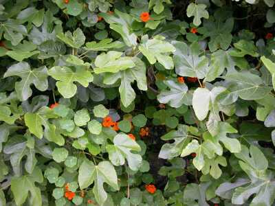 5377. Fig bush, Ficus carica with Indian cress, Tropaeolum majus,