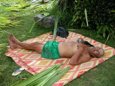 6293. Mr. Mairau enjoying some peaceful moments after the pandanus harvest