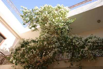 8783. Jasmin-like plant overhanging from the balconies above the yard