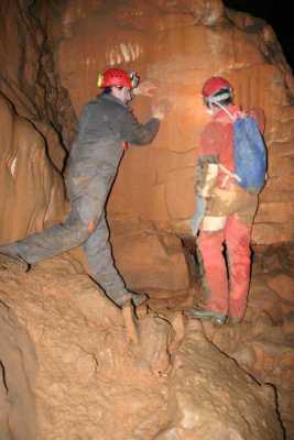 Pictures are 266 times 400 pixels in size, a click on an image reveals a 533 times 800 pixel version. Numbers in front of the pictures correspond to serial numbers of original shots. Cave parts have been named by the author, labels in and out refer to the viewing direction - either from the entrance towards the end of the cave or from the inside towards the entrance. Where the person on the picture is not given, it is Marjan. Complete names of the fellow cavers who also contributed to the pictures: Marjan Baričič, Riko and Rok Grecs. Photo and copyright (c) Primož Jakopin 2007.