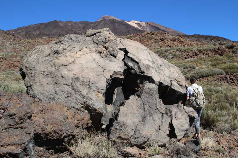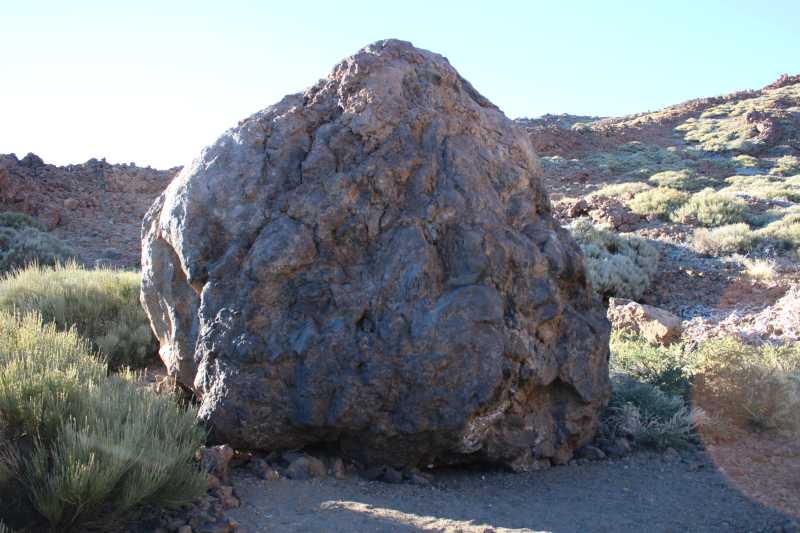 24264. Above the cave the trail crosses another lava ridge and follows, for 20 minutes or so, a long shallow valley, dotted with volcanic bombs, the biggest, depicted here, has a diameter of over 4 meters.