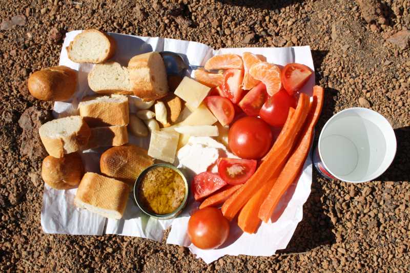 24231. A little snak at about 2,800 meters, some time past one o'clock p.m. - bread, tuna, cheese, garlic, tomatos, carrots, water