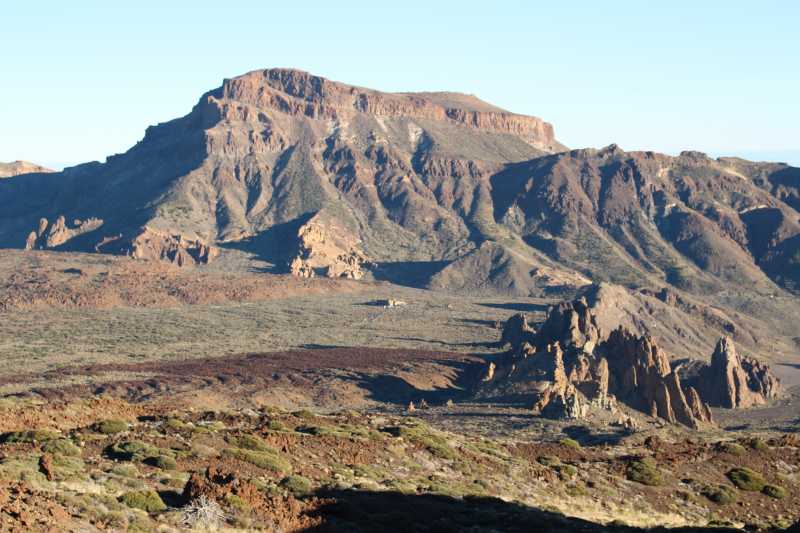 24442. View from the Upper Cave down the slope to the plain east of Roques de Garcia, El Parador Nacional del Teide - Centro de Visitantes and the Alto de Guajara mountain above it. The virtual line, starting at the church west of Centro de Visitantes and passing exactly through the middle of the two rocks from the previous picture (here center right) is crossing the Lower Cave entrance, as well as Upper Cave entrance; its southern grid can be seen in the lower left corner of the picture.