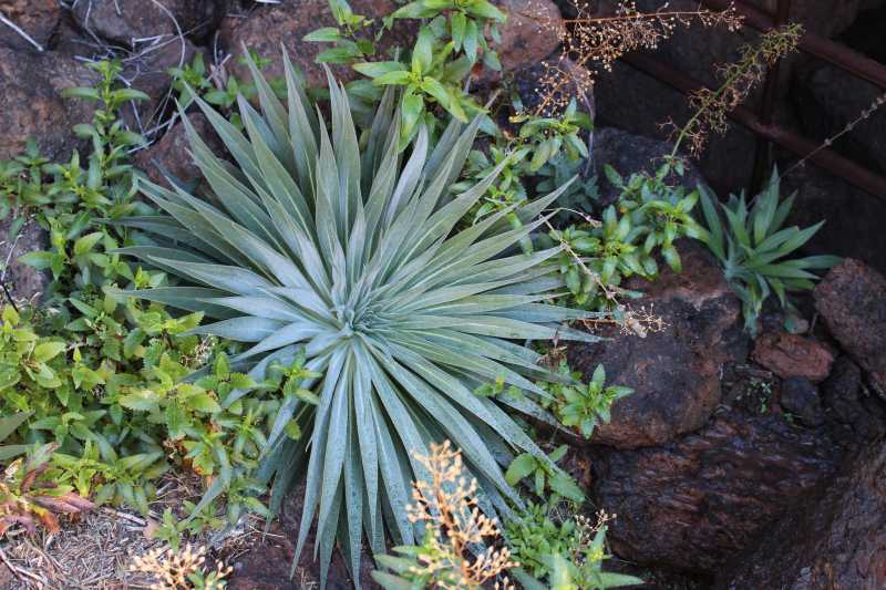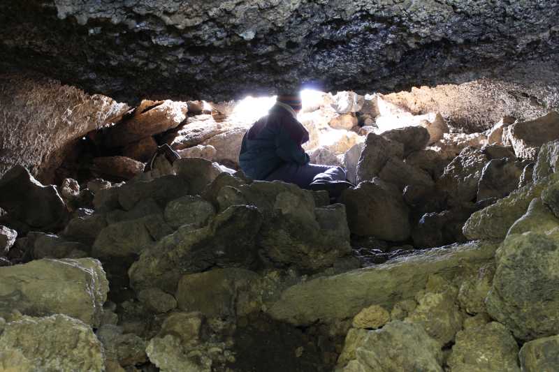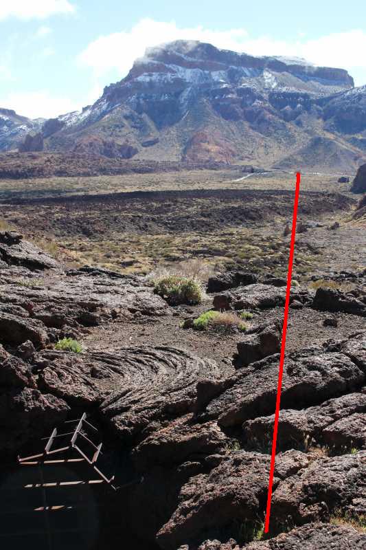 24442 + red line. Virtual line, connecting the church, the two rocks and both caves, is shown in red. The easiest way to find both caves is to start at the beginning of the trail 23, which branches off the trail 3 (trail around Roques de Garcia) at a solitary rock, about 2.5 meters in diameter, some 200 meters before trail 23 turns south (and down). Follow the trail (23, northwest) for about 15 minutes, over just slightly ascending terrain until it starts to ascend more vigorously. A large Pahoehoe-type lava field is at the right of the trail, and low 'A'a-type lava ridges are at a distance on the left. Turn right and cross the Pahoehoe-type lava until you reach the virtual line connecting the church and passing through the middle of the two rocks to the east of the main Roques de Garcia group - the line is shown in red. After the virtual line is reached, ascend the lava field so that you stay on the line. Soon the Lower Cave is reached, and from there, maybe 300 meters or 5 minutes far, also along the red virtual line, proceed to the Upper Cave. Both caves are not far to the east of the trail 23, no more than 100 meters or so. No parts of the gated Lower Cave can be accessed so it is not depicted here.