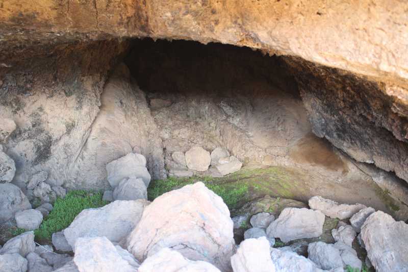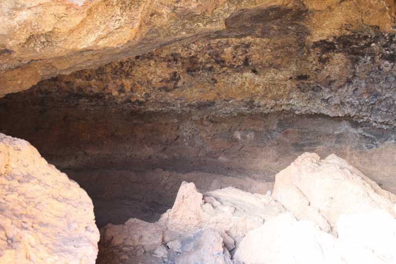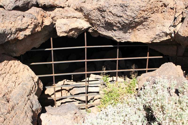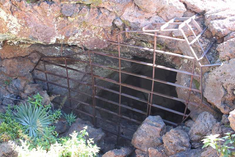24444. Upper Cave is the longest and most interesting Roques de Garcia cave, recent discoveries have prolonged it from 800 meters to 2 kilometers. Some parts of the entrance are accessible to visitors. In the picture: lower part of the entrance, view from below, from the south, with all its openings gated.