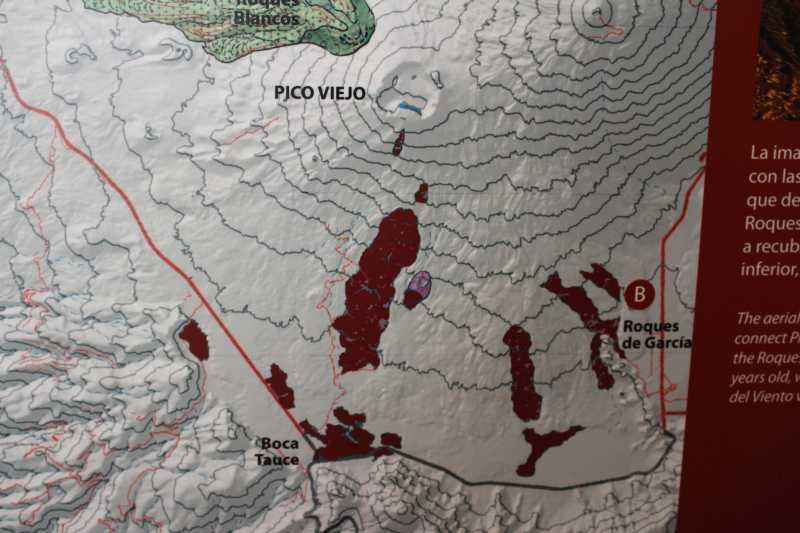 24525. Simplified geological situation of the Roques de Garcia surroundings. Dark red colour shows areas of Pahoehoe-type lava, suitable for cave development. Caves, described on this page and in general known as Roque de Garcia Caves are situated on the patch, shown on the map NW of the letter B, right-center of the picture. The picture was taken in Icod de los Vinos, in the Cueva del Viento Visitor's Centre (Centro De Visitantes, Cueva Del Viento).