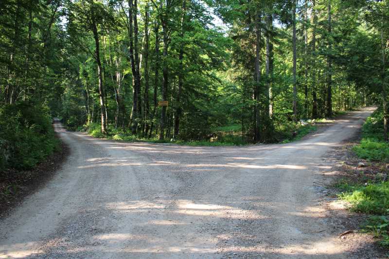 25828. 400 m from the junction the road starts to descend, center left in this picture. The road to the right ends after 100 m, with a large clearing in the forest, used for loading of timber. At the end of the clearing, on the left side, is also a foot trail that leads down to Križna jama cave, 200 m away.