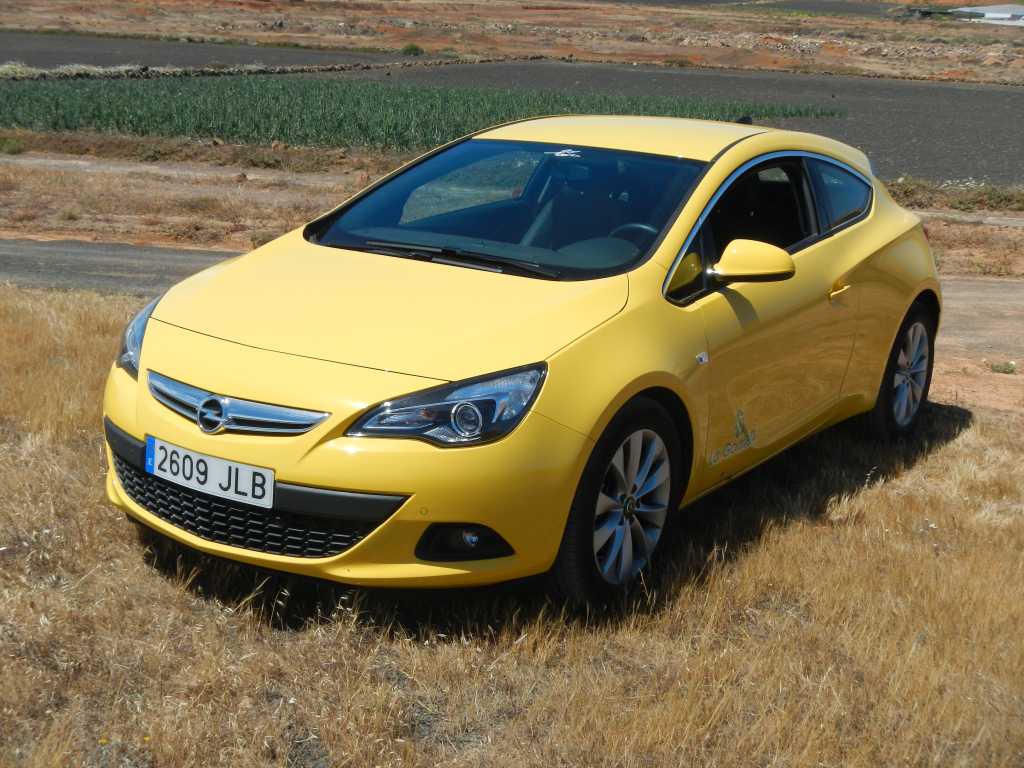 29569. Rented car, an Opel GTC, 140 HP, front and port side, from higher viewpoint. The company, Cabrera Medina, had no car available in the least expensive category so the GTC was offered instead. It was a real pleasure to drive, 6 speeds, extremely cozy ride - 100 km/h at 2,100 rpm. The only drawback was the lack of 4 doors to load and unload the backpacks, hats more easily.
