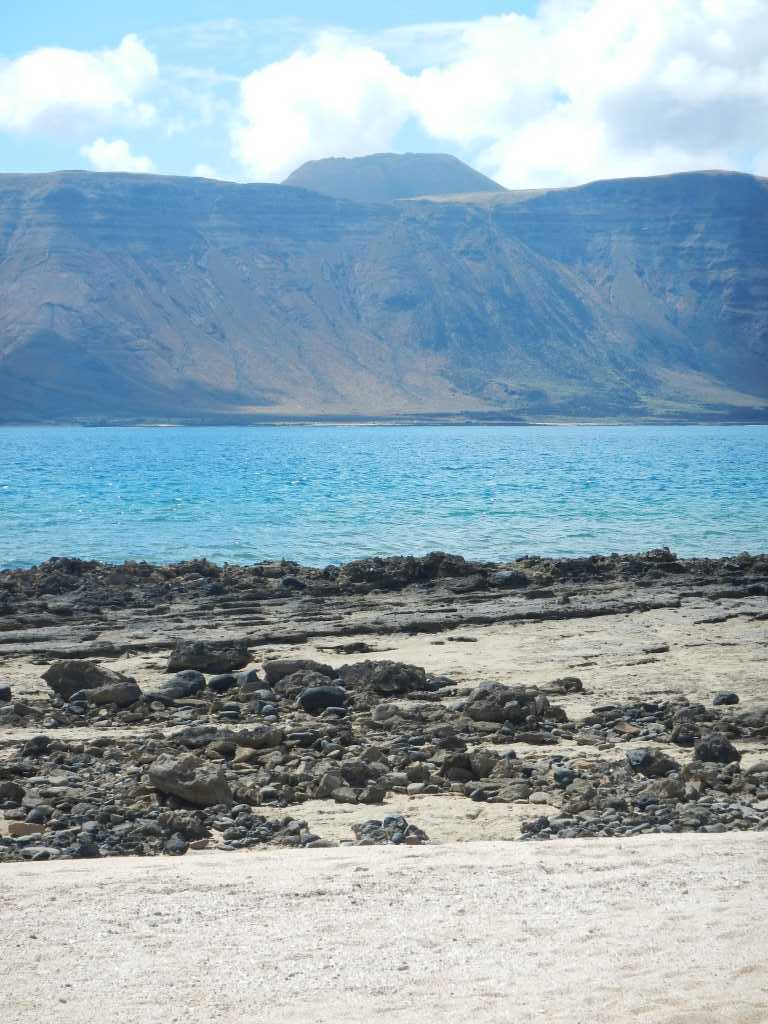 29915. View southeast across the beach, El Rio strait, the cliff and to Montaña Corona