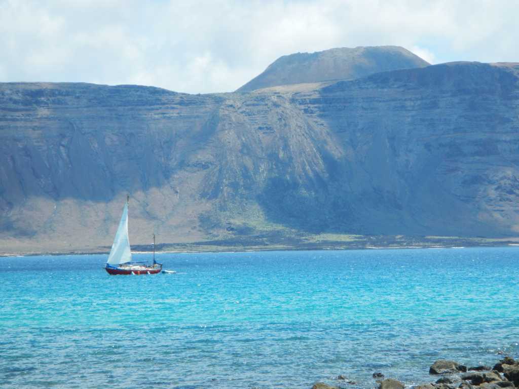 29923. View across El Rio strait with a lonesome sailing boat, propelled by its jib