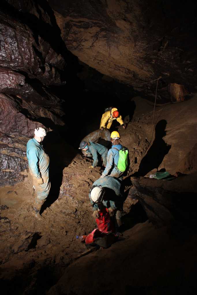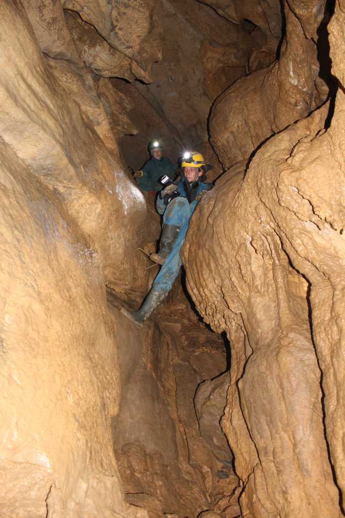 31341. Tomek is assisting Iza who is climbing down the final vertical drop in Ičotov rov.