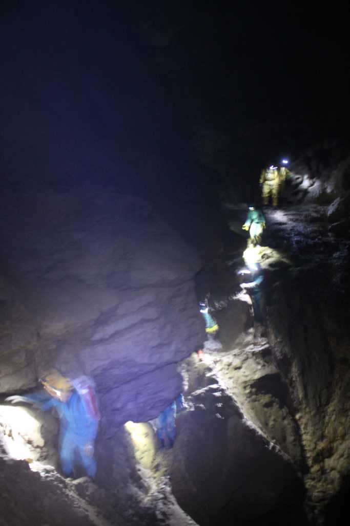 31343. The party on the steep slope below Hansov kapnik giant stalactite, on-camera flash