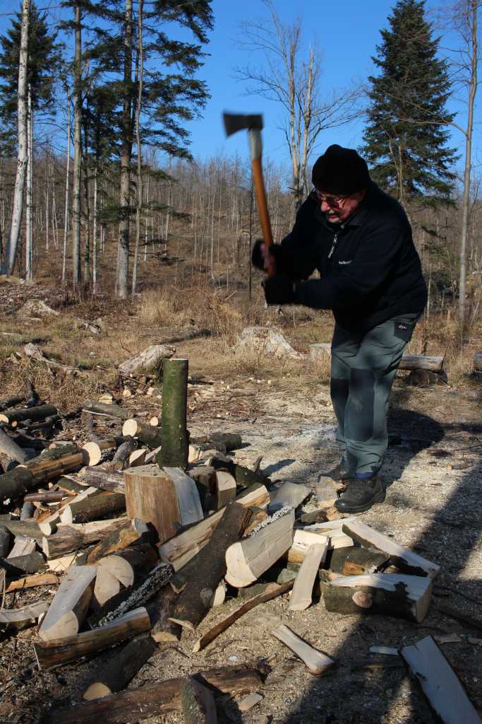 33787. Ičo is chopping the beech logs - the axe above his head ...