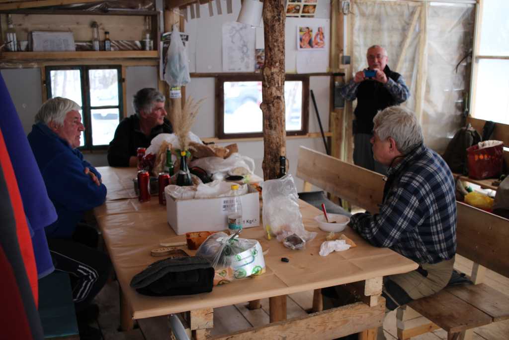 34017 - 34019. Panoramic view of the relaxed after-work time in the room, filled with warmth from the stove and candid light from the car battery powered light (12 V converted to 220 V) suspended from the ceiling; Metod, Gregor, Žan, Mare, Andrej and Marjan. Some were vividly engaged in a discussion on how to solve the problems ahead with experience from the past achievements, some were just paying attention, and some simply enjoyed the cosy tranquil moments.