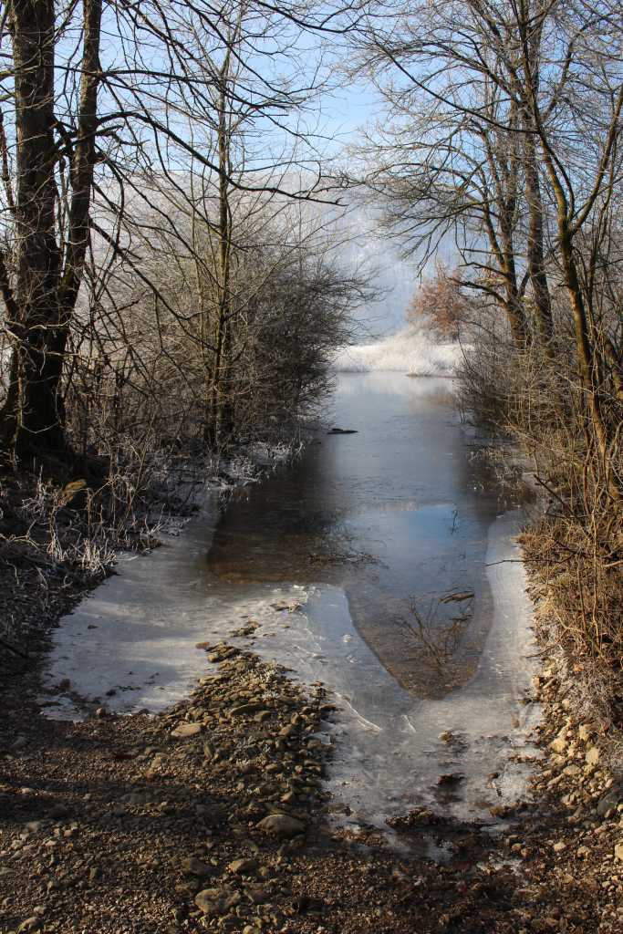 37846. It was only the first real cold morning and so the ice barely started to cover the Unec river banks, as here on the trail to Breg below Laze village.