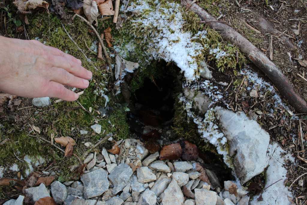 34403. There was no air current detected as the outer and inner temperatures are about the same. Tevje (it has no proper English name), Hacquetia epipactis, above the entrance, is just about to start blooming.