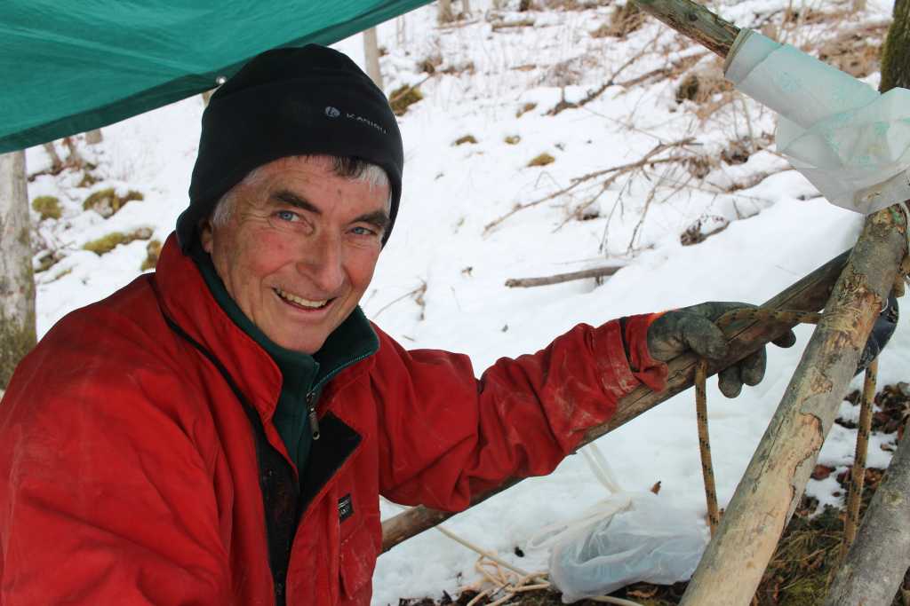 34396. Žan came for a brief inspection, here he is checking the entrance rain-cover tarpaulin supporting rope.