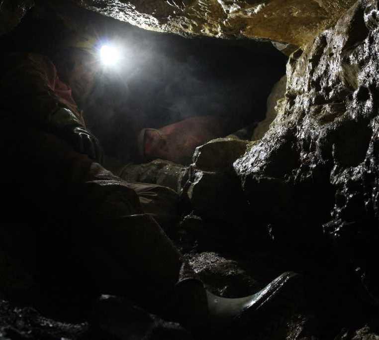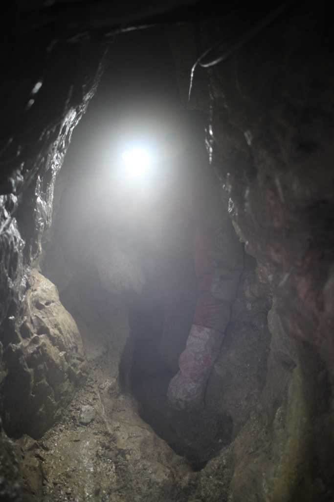 33804. ... with the wall of the new (too narrow to pass) tunnel, perpendicular to the current one. To the left side the new tunnel is closed immediately, while on the right side the situation is different. Fist-sized stone, thrown into it, rolled down about 2 m far and 1 m down (judged by the sound). Author turned around, head forward and managed to push both hands, one with a small torch and the other with the camera around the right corner.