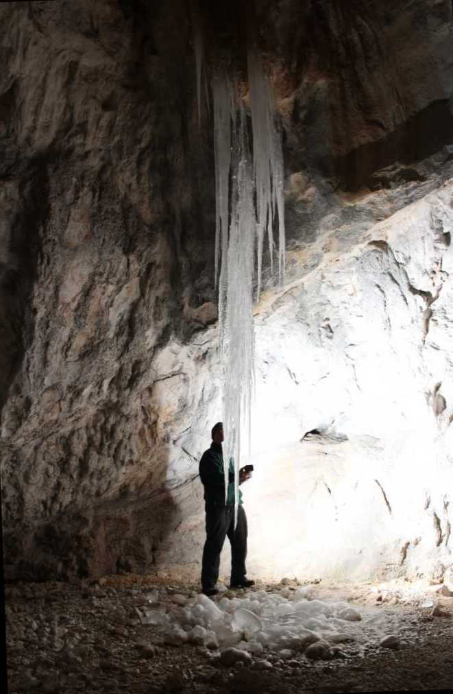 34182. Recent warmer days have eaten up the ice curtain in the northern entrance considerably - only this ice pillar remained - with Brajko in a close ...