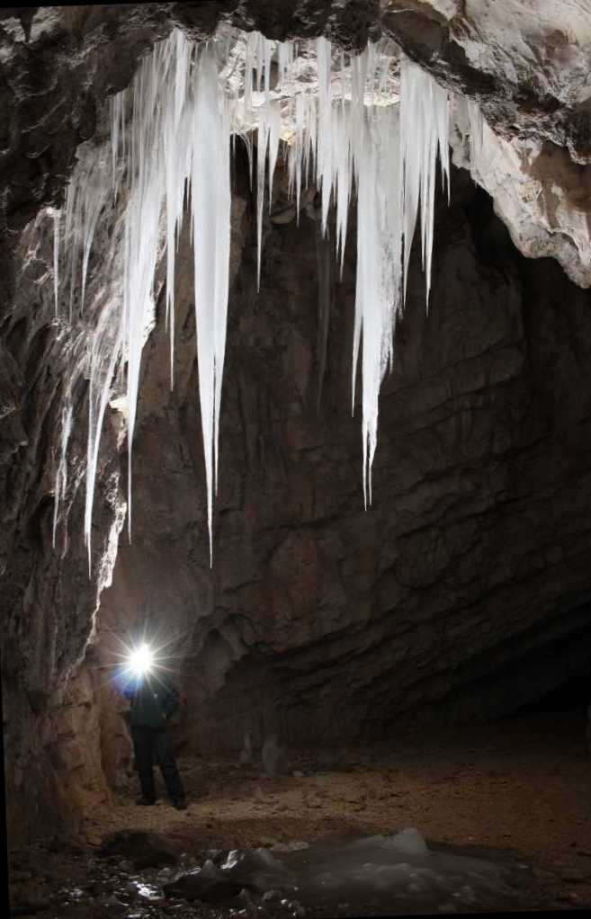 34091. Warm weather in the past two days started to melt the icicles ever faster and water trickled from almost every hole in the ceiling, as can be seen in the right side of the picture; Brajko at the side of a major ice stalactite.