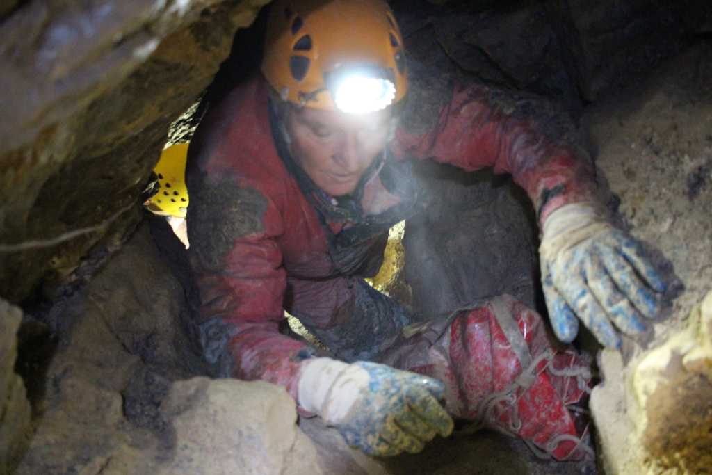 33743. Marjan is hammering the chisel at the current cave end at - 15 m.
