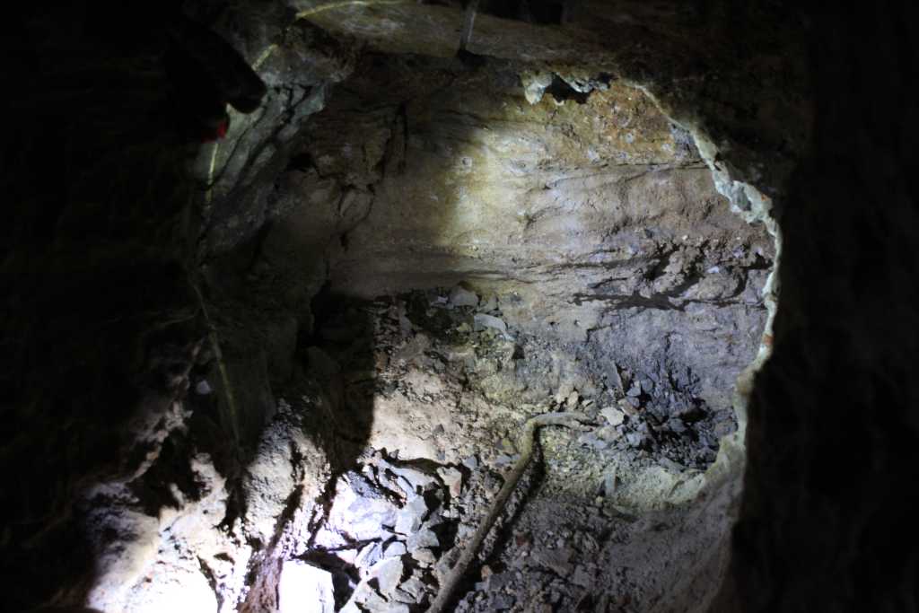 35355. Wider view of the end of the tunnel after the photographer cleared a few buckets of rocks which Marjan excavated at the end of work, illuminated from the top center. Looks like a dead end.