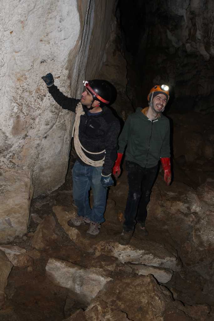 34192. The narrow meander does continue horizontally to the left of the chamber, yet it would be a grave mistake to move on in this direction. The air current is namely coming from a hole in the ground, below the sphinx-like rock formation in the center of this picture. The hole is partly blocked by stones which fell there during the excavation but the writer of these lines managed to throw a fist-sized stone in it and it fell down at least a meter.