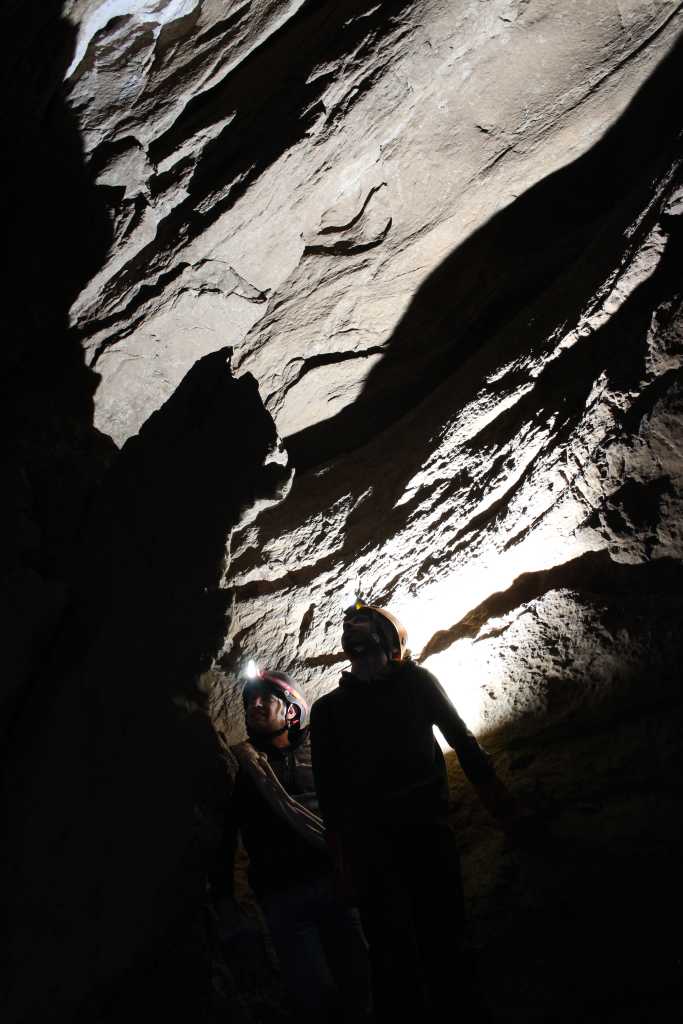 34301 - 34302. To take this panoramic picture of the continuation, illuminated from below, the tiny light on a headband was lowered into the hole using the crowbar. It was very tricky to pull the light back again ...