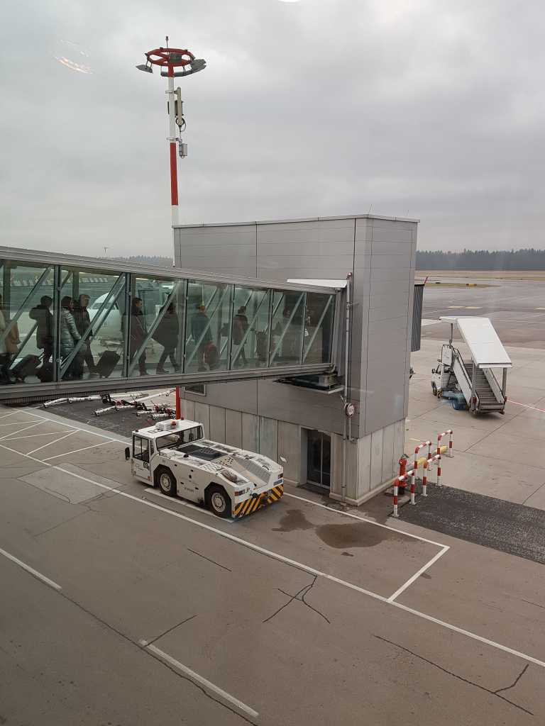 38213. Passengers waiting in the final leg of the embarking corridor with the back side of the plane