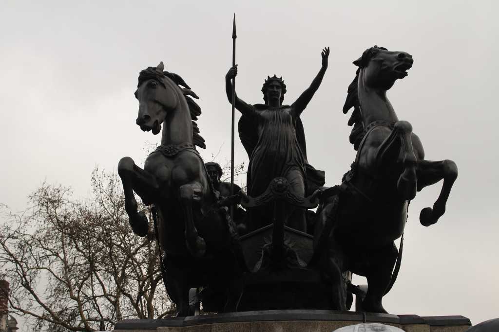 38236. Boadicea and Her Daughters by Thomas Thornycroft, made from 1856 to 1883. Bronze sculpture, NW corner of the Westminster Bridge
