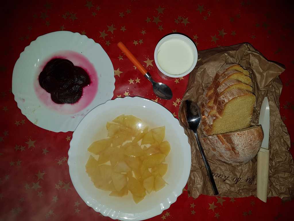 38399. A simpler snack: goat yogurt, corn bread, beetroot salad, apple compote