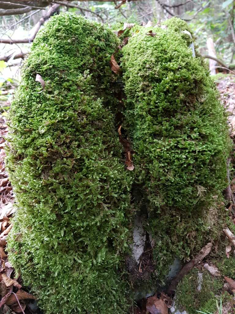 41756. A moss overgrown stone resembling what is called le sourire du plombier in French.