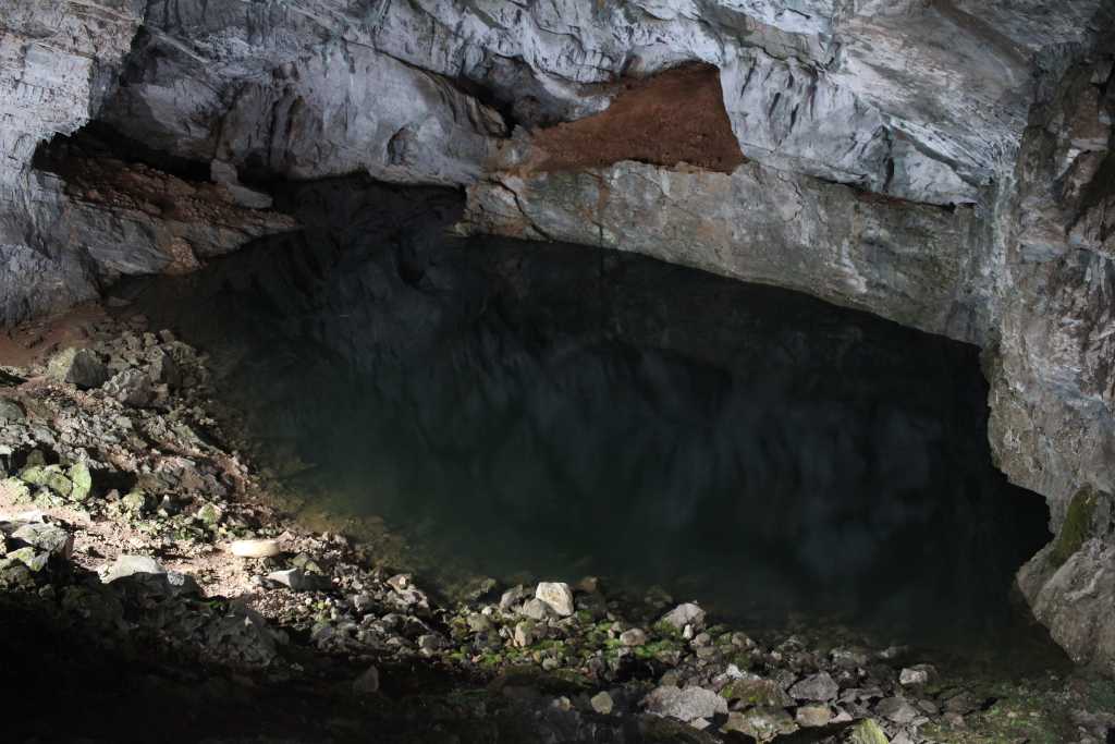 45984. Top night view of the lake at the bottom of the entrance hall. This view with addition of a caver in a boat will be published elsewhere.
