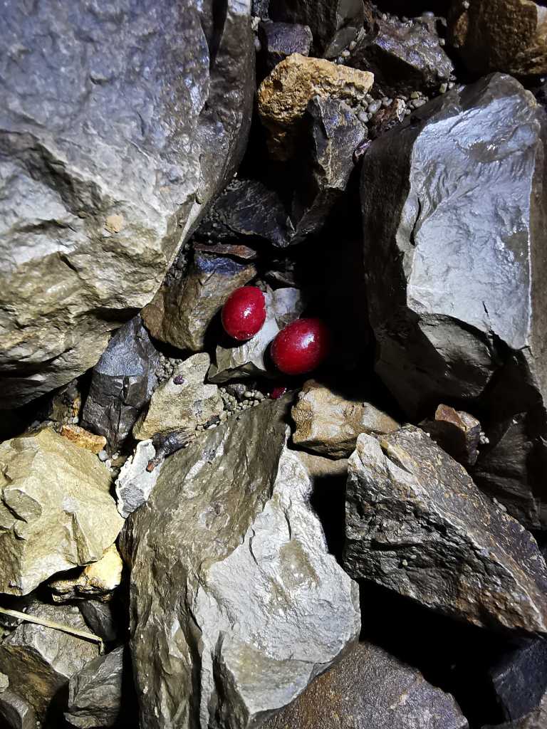48253. Two fruits of Cornelian cherry, Cornus mas, they fell through the second cave entrance, an 11 meter shaft.