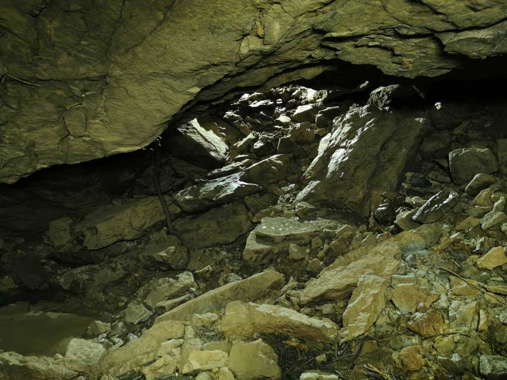 49074. Vhod v jamo, iz struge - lahno nagnjeno kamnito dno rova se v ovinku proti jugu spušča v notranjost.